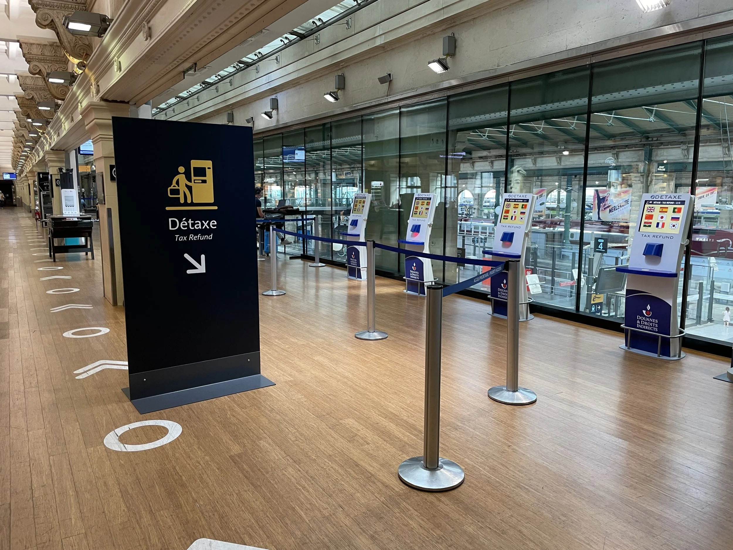 Une fois passé le contrôle de sécurité, vous devriez voir des panneaux (Détaxe) menant à des bornes libre-service - c'est là que vous traiterez votre remboursement ! Si vous ne trouvez pas les kiosques, demandez simplement au personnel de vous diriger vers les kiosques de détaxe.